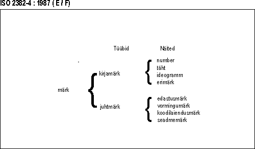 | character — A member of a set of elements that is used for the representation, organization, or control of data. (Characters may be categorized as follows:) (01 Fundamental terms; 01.02 Information representation; 01.02.11) | märk — Andmete esituseks, korralduseks või juhtimiseks kasutatava elemendihulga liige. (Märke võib liigitada nii:) (01 Põhiterminid; 01.02 Infoesitus; 01.02.11) |