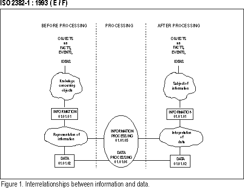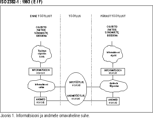 | data — A reinterpretable representation of information in a formalized manner suitable for communication, interpretation, or processing. (Data can be processed by humans or by automatic means.) (See figure 1.) (01 Fundamental terms; 01.01 General terms; 01.01.02) | andmed — Informatsiooni taastõlgendatav esitus formaliseeritud kujul, mis sobib edastuseks, tõlgenduseks või töötluseks. (Andmeid võivad töödelda inimesed või automaatsed vahendid.) (Vt. joonis 1.) (01 Põhiterminid; 01.01 Üldterminid; 01.01.02) |