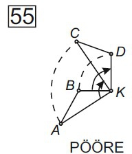 | pööre [pöörde, pööret, pöördeid] geomeetria pöördel ümber punkti (pöörde keskpunkti) või ümber sirge (pöördetelje) liigub iga punkt mööda ringjoont samas suunas ühe ja sama nurga (pöördenurga) võrra. Δ joonisel 55 kujutatud lõik AB teiseneb pöördel täisnurga võrra ümber punkti K lõiguks CD. ● поворот; вращение |