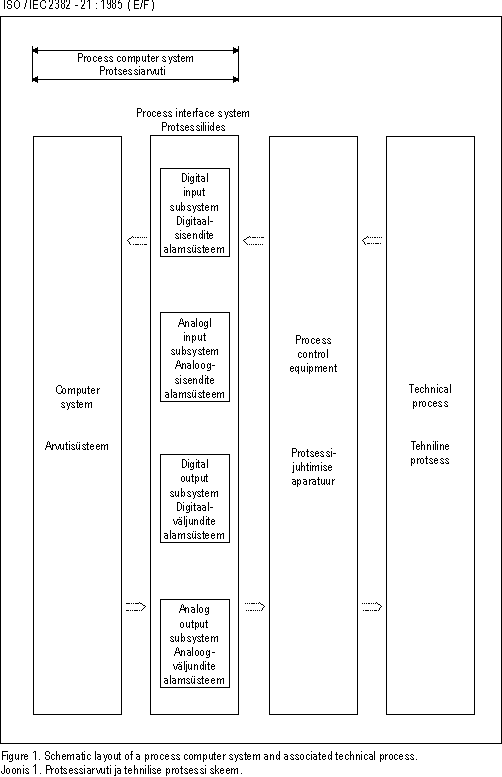 | technical process (=process) — A set of operations performed by equipment in which physical variables are monitored or controlled. (See figure 1.) Eg. distillation and condensation in a refinery; autopiloting and automatic landing in an aircraft. (21 Interfaces between process computer systems and technical processes; 21.01 General; 21.01.01) | tehniline protsess (=protsess) — Operatsioonikogum, mida sooritab aparatuur, milles seiratakse või juhitakse füüsikalisi muutujaid. (Vt joonis 1.) Nt. destilleerimine ja kondenseerimine destillatsioonitehases, lennuki automaatne piloteerimine ja maandamine. (21 Protsessiliidesed; 21.01 Üldmõisted; 21.01.01) |