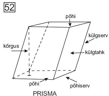 | prisma [prisma, prismat, prismasid] geomeetria hulktahukas, mille kaks tahku on vastavalt paralleelsete külgedega võrdsed hulknurgad ja ülejäänud tahud on rööpkülikud, millel on kummagi hulknurgaga üks ühine külg. Δ hulktahukas joonisel 52. ● призма |