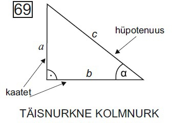 terav_nurga koosinus [- koosinuse, - koosinust, - koosinusi] trigonomeetria arv cos α, mis võrdub täisnurkse kolmnurga teravnurga α lähiskaateti ja hüpotenuusi jagatisega. Δ joonise 69 tähistustes cos = . Vt ka mis tahes nurga koosinus ● косинус острого угла |