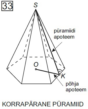 | korra_pärane p'üramiid [korra_pärase p'üramiidi, korra_pärast p'üramiidi, korra_päraseid p'üramiide] geomeetria püramiid, mille põhjaks on korrapärane hulknurk ja mille külgservad on võrdsed. Δ joonisel 33 kujutatud korrapärase püramiidi põhjaks on korrapärane kuusnurk. ● правильная пирамида |